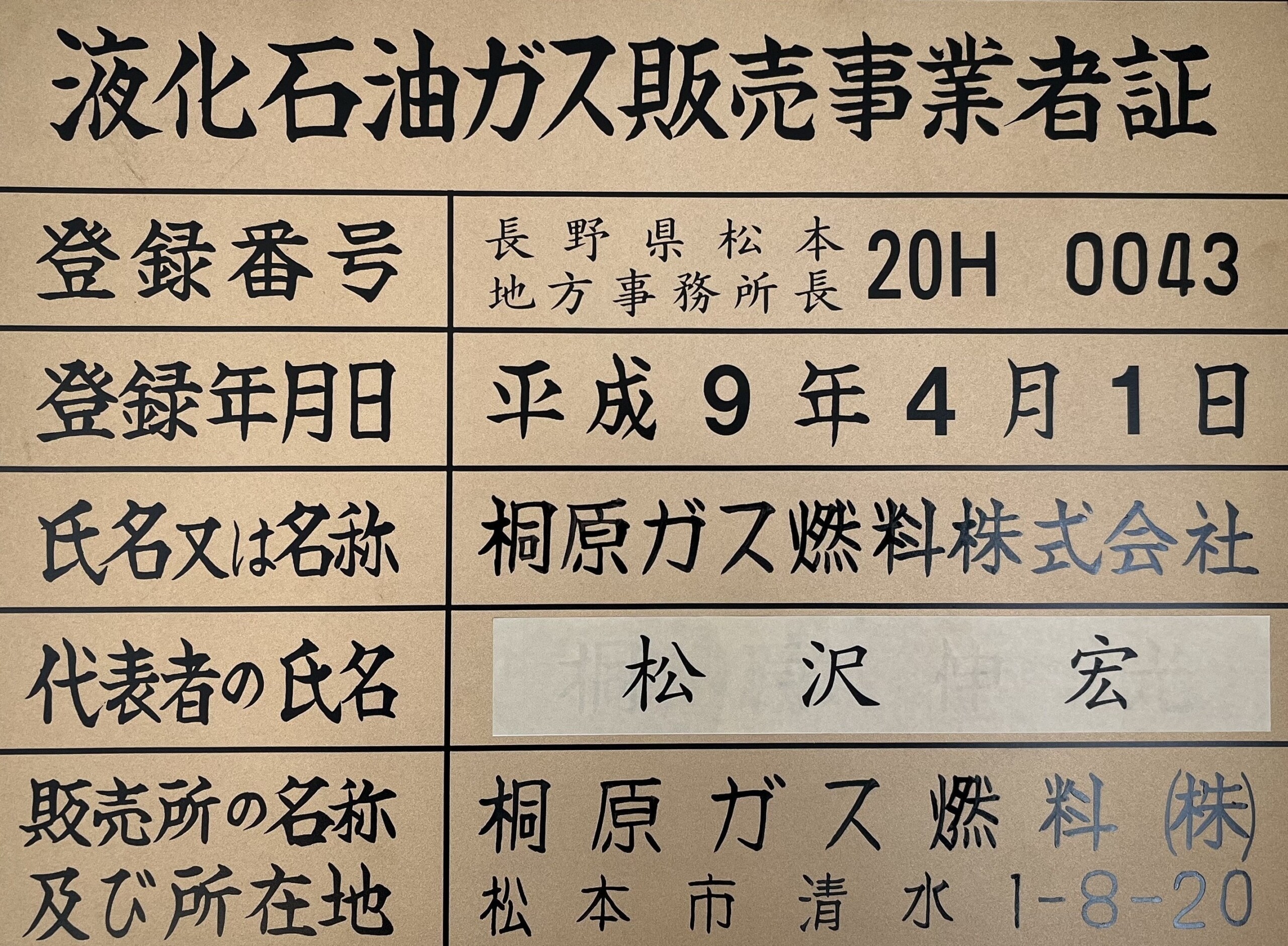 販売店の名称及び所在地 桐原ガス燃料株式会社